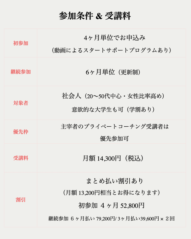 ・継続参加:6ヶ月単位(更新制)